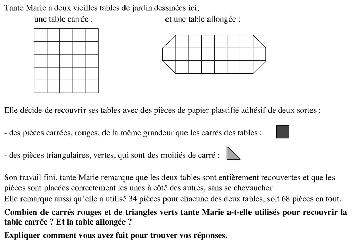 - Comprendre que, puisque tante Marie utilise 34 pièces pour chacune des deux tables, elle ne peut pas, pour paver la première table, utiliser uniquement des pièces carrés (il en faudrait alors uniquement 25). Pour l’autre table, il est évident que les formes seront mélangées, mais il faut aussi comprendre qu’il doit y en avoir 34. C’est le point central de la compréhension de l’énoncé.