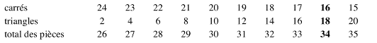 - Pour la table carrée, on peut faire successivement plusieurs hypothèses sur le nombre de pièces carrées et sur les nombre correspondant de pièces triangulaires permettant de compléter le pavage, et vérifier s’il y a effectivement 34 pièces, avec un tableau comme celui-ci :