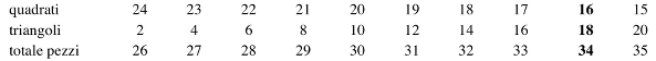 fino ad arrivare alla soluzione: 16 pezzi quadrati e 18 triangolari. Se si prosegue, anche di un solo termine la ricerca, si può constatare che la soluzione è unica. (Questo aspetto potrebbe essere ripreso nell’uso in classe del problema.)