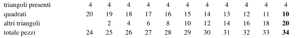 - Per il secondo tavolo lavorare con una tabella del tipo seguente che tiene presente, per esempio, che ci sono già obbligatoriamente 4 triangoli:
