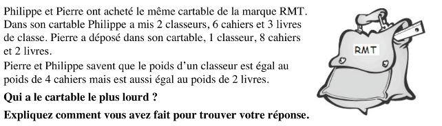- Déduire que le cartable de Philippe est plus lourd que celui de Pierre puisqu’un classeur (soit 4 cahiers) est plus lourd que 2 cahiers.