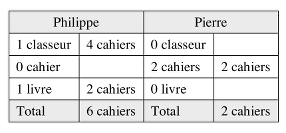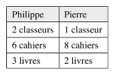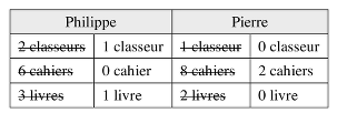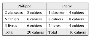 - Dresser la liste du matériel de Philippe et Pierre, par exemple sous la forme d’un tableau :