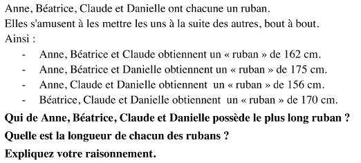 - Trouver la longueur de chacun des rubans, algébriquement en résolvant le système qui traduit les quatre indications :