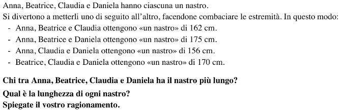 Determinare la lunghezza di 4 nastri A, B, C, D conoscendo le lunghezze di loro giustapposizioni 3 per 3.