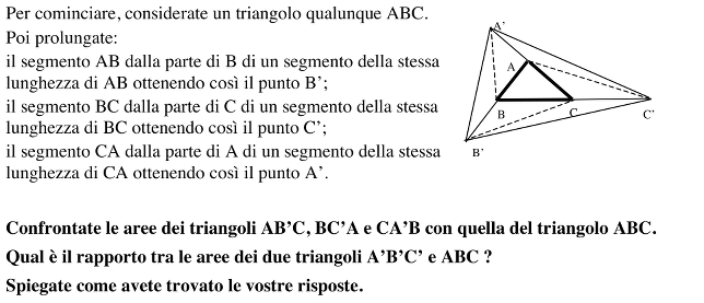 Confrontare le aree di triangoli costruiti prolungando i lati di un triangolo dato con l'area di questo primo triangolo.