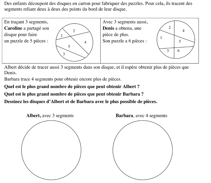 Découper un disque à l'aide de 3 (resp. 4) cordes pour obtenir le plus de pièces possibles.