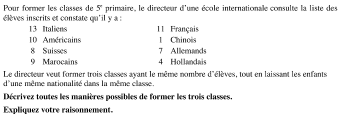 Ou: penser que dans la classe des 13 Italiens les 8 autres élèves ne peuvent être que les 7 Allemands et le Chinois ou les 8 Suisses. Dans le premier cas, dans la classe des 11 Français, on ne peut ajouter que les 10 Américains pour arriver à 21, ce qui conduit à la solution 1 (la troisième classe ne peut être formée que de 8 + 9 + 4). Dans le second cas (21 = 13 + 8), la classe des 11 Français peut être complétée par les 9 Marocains et le Chinois (solution 3) ou avec les 10 Américains (et l’on arrive à la solution 2). Puisqu’il n’y a pas d’autres cas possibles, on peut conclure qu’il n’y a que ces trois solutions.