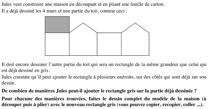 - Comprendre que le « patron » qui est une figure plane devra être découpé et plié pour réaliser la maison et que, avec les 4 façades et le pan du toit dessiné sur la figure, il ne se « referme » pas mais laisse un « trou » qui devra être comblé par l’autre pan du toit.