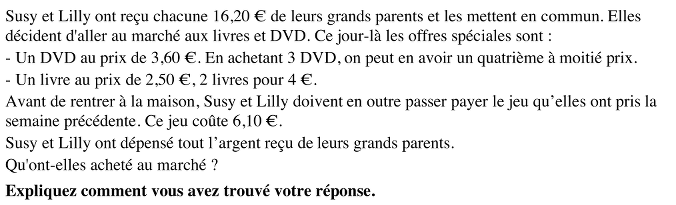 Déterminer les achats faits par Suzy et Lilly sachant qu'elles ont dépensé 2 x 16,20 euros, qu'elles ont payé 6,10 euros un jeu, qu'un DVD coûte 3,60 euros (mais en achetant 3 DVD, on peut en avoir un quatrième à moitié prix), qu'un livre coûte 2,50 euros (mais deux livres pour 4 euros).