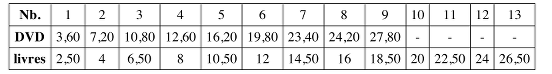 et se rendre compte que pour obtenir 26,30 euro (partie décimale : 30) on peut, par exemple, constater que les parties décimales des prix des DVD et des livres ne peuvent être respectivement que 80 et 50 et trouver la seule possibilité : 19,80 et 6,50, ce qui correspond à 6 DVD et 3 livres.