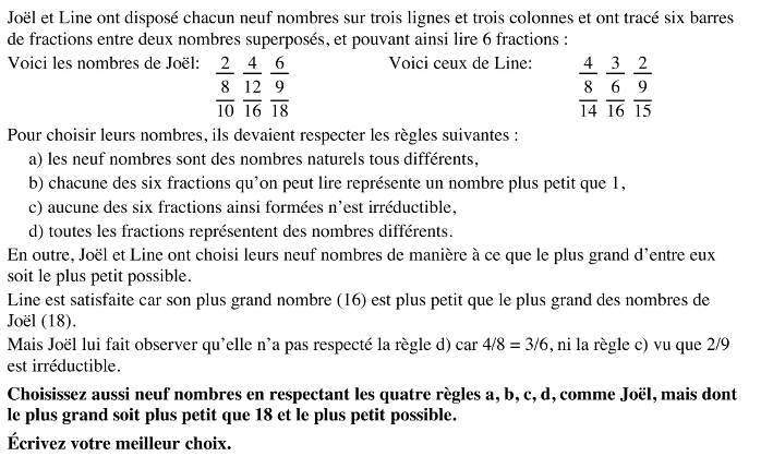 Trouver 9 nombres dont la disposition forme 6 fractions satisfaisant les propriétés: inférieures à 1, réductibles, de valeurs différentes.