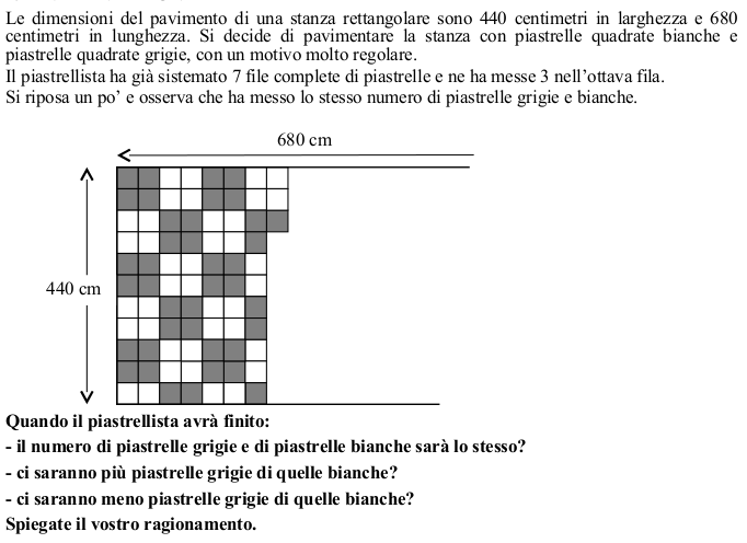 Confrontare il numero di quadrati bianchi e grigi disposti a scacchiera, che pavimentano un rettangolo reticolato di 680 cm x 440 cm e di cui sono visibili 7 ranghi completi di 11 quadrati su tutta la larghezza. Si tratta di determinare il numero di file nella lunghezza.