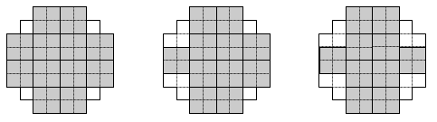 - Commencer le pavage avec des plaques A, en pensant à l’argument intuitif (pas toujours correct, car il faut ensuite combiner deux autres sortes de plaques) « plus on utilise de grandes plaques, moins il y aura de plaques au total ». Placer des plaques A en pensant qu’il faudra ensuite compléter avec seulement des plaques B et C. Ces dispositions - avec 12, 11 ou 10 plaques A - par exemple, sont impossibles :