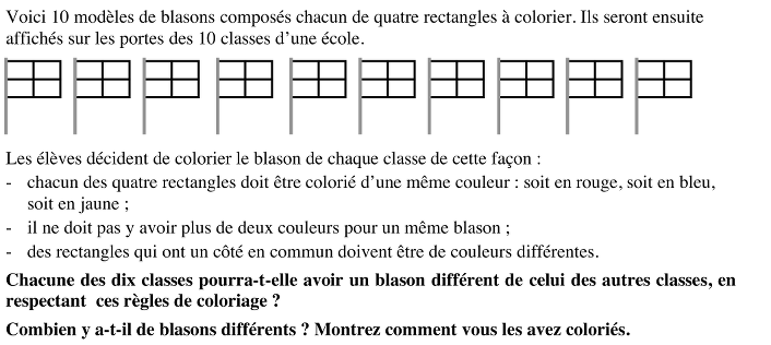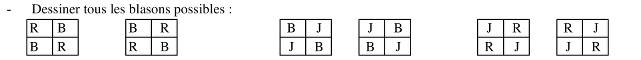- Comprendre que, avec deux couleurs par blason et des rectangles sans côtés communs, il n’est pas possible d’avoir une répartition « trois rectangles d’une couleur et un rectangle de la seconde couleur », mais que les répartitions sont obligatoirement « deux rectangles d’une couleur, et deux rectangles de la seconde couleur dans une disposition en damier »