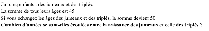 Déterminer l'âge de 2 jumeaux et 3 triplés connaissant la somme de leurs âges (45) et la somme des âges en inversant âge des triplés et âge des jumeaux (50).