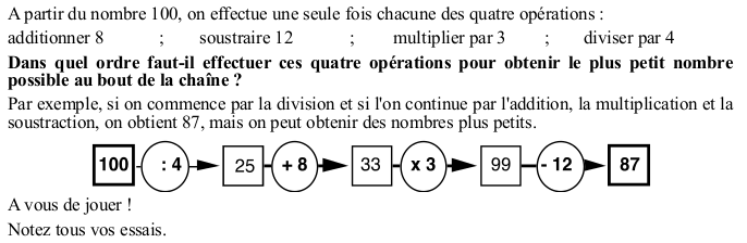 Ordonner 4 opérations élémentaires (+8, -12, x3, :4) pour, à partir de 100, obtenir le résultat minimum.