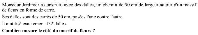 Déterminer les dimensions d'un carré qui peut être bordé de 132 carrés juxtaposés de 50 cm de côté (dans un contexte de massif de fleur entouré d'un chemin.
