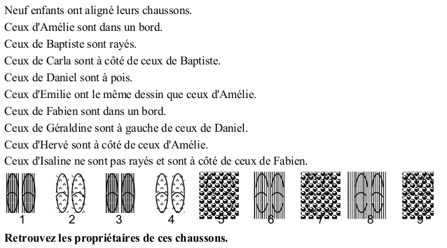 Déterminer quels chaussons (9 paires) appartiennent à quel enfant à partir de 9 propositions.