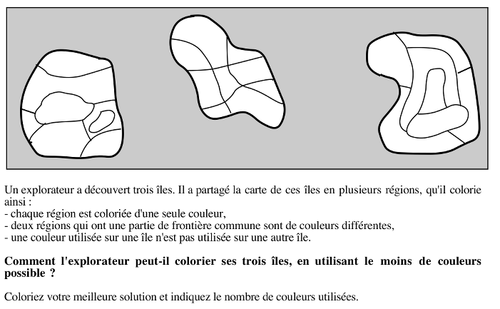 - observer que deux couleurs suffisent pour l'île centrale, qu'il en faut trois pour l'île de gauche et quatre pour celle de droite. En déduire que le nombre minimum de couleurs est 9.