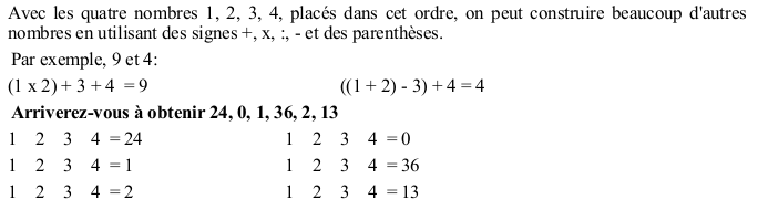 Avec les 4 nombres 1, 2, 3, 4 (dans cet ordre) des parenthèses et des signes d'opérations obtenir 24, 1, 0 , 36, 2, 13.