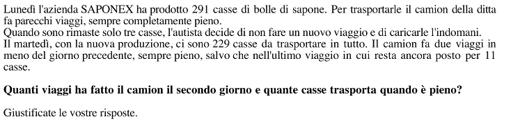 - dedurre che la differenza corrispondente a due viaggi a pieno carico è di 48 casse e che ci sono quindi 24 casse per viaggio;