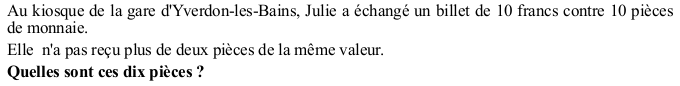 Constituer 10 francs à l'aide de pièces de monnaies, sans utiliser plus de deux pièces de la même valeur.