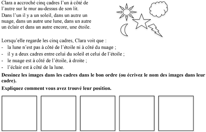 - Comprendre que les cinq figures données doivent être disposées dans les cinq cadres en respectant une liste de contraintes.
