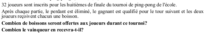 Trouver le nombre total de match joués par 32 joueurs lors d'un tournoi de ping-pong à partir des 8e de finale.