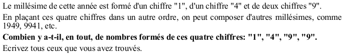 Trouver le nombre de nombres que l'on peut composer avec un chiffre "1", un chiffre "4" et deux chiffres "9".