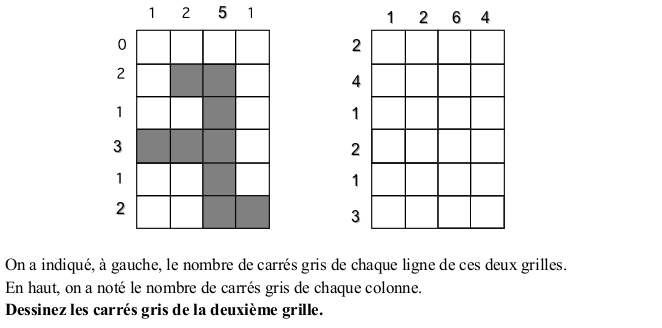 Indiquer les carrés grisés dans une grille 6 x 4 connaissant le total de carrés grisés par ligne et par colonne.