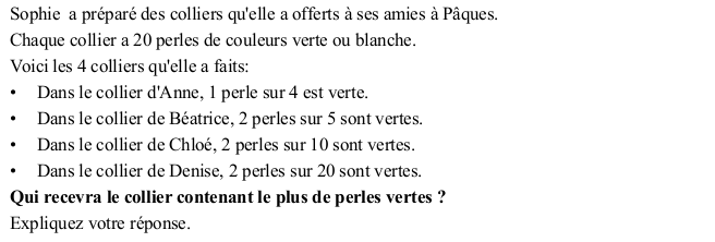Désigner la proportion la plus grande entre 1 sur 4, 2 sur 5, 2 sur 10 et 2 sur 20.