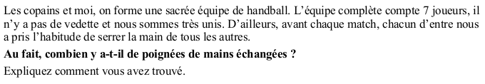On a mis les 7 joueurs sur la feuille et on a fait un diagramme fléché, et on a trouvé : 24 poignées de mains.