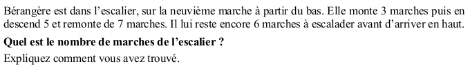 Trouver le nombre de marche d'un escalier sachant qu'en montant 3 marches, en descendant 5 et en remontant 7, à partir de la neuvième, il reste encore 6 marches à escalader avant d’arriver en haut.