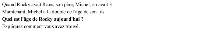 Trouver les âges de deux personnes qui à une époque avaient respectivement 8 et 31 ans et dont l’âge de la seconde vaut aujourd'hui le double de l’âge de la première
