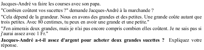 Décider si 1 Fr suffit pour acheter deux grandes sucettes, sachant une grande et une petite coûte 80 cts et qu'une grande coûte autant que trois petites.