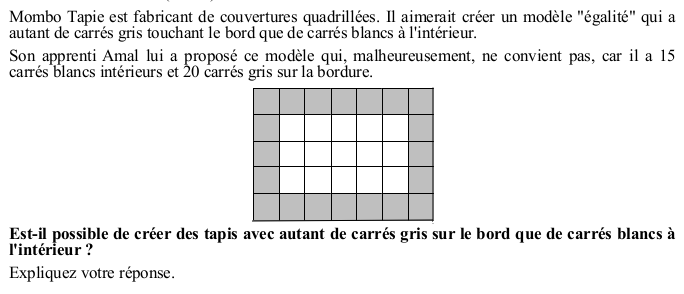 Trouver les dimensions d'un rectangle (couverture) quadrillé de telle manière que le nombre de carrés sur le bord soit égale au nombre de petits carrés « intérieurs ».