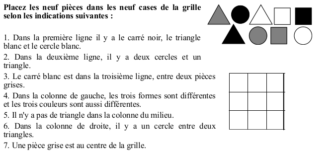 Placer neuf pièces de formes et de motifs différents dans un tableau 3 x 3 de telle manière que le résultat satisfasse sept relations donnant des positions relatives.