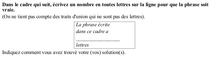 Compléter "La phrase écrite dans ce cadre a ... lettres" par un nombre en toutes lettres, de telles manière qu'elle soit vraie.