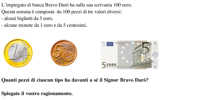 - Appropriarsi dell’enunciato e distinguere i 100 oggetti (n biglietti da 5 euro e m monete da 1 euro e da p monete di 0,05 euro) dal valore che rappresentano in totale: 100 euro, per arrivare alle due relazioni mentali o scritte: