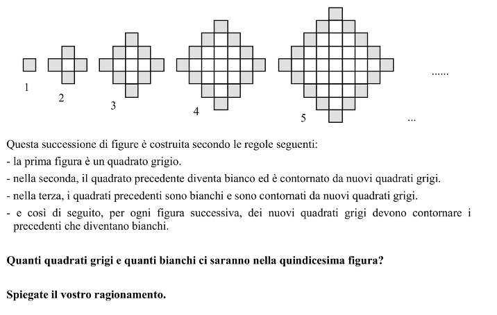 Determinare il numero di quadrati grigi e quadrati bianchi nella quindicesima figura di una sequenza costruita come segue: la prima figura è un quadrato grigio, nella seconda, il quadrato precedente diventa bianco ed è circondato da nuovi quadrati grigi, nella terza i vecchi quadrati sono bianchi e completamente circondati da nuovi quadrati grigi, e così via.
