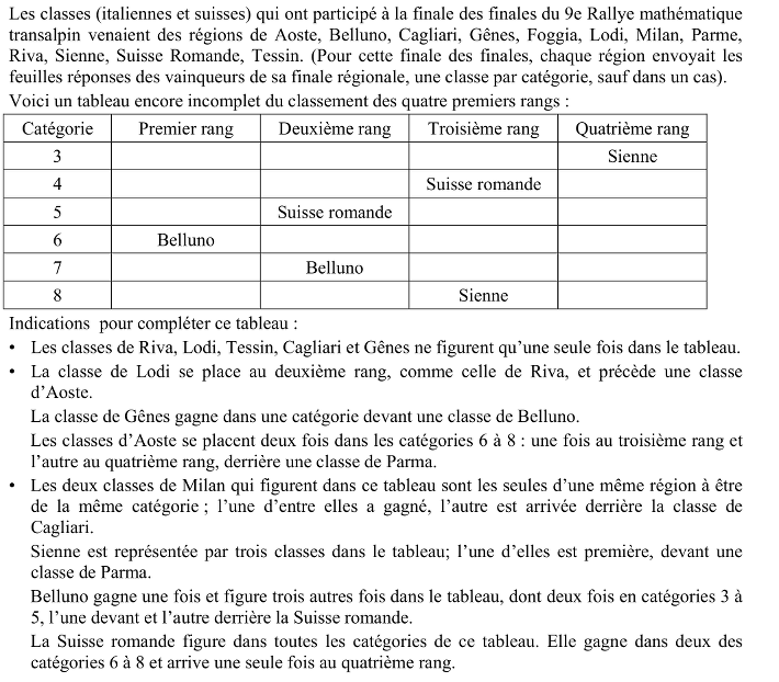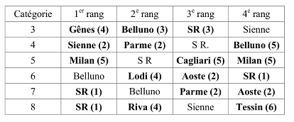 Compléter le tableau présentant le classement (premier rang au quatrième) de 32 classes de 12 sections par catégorie.