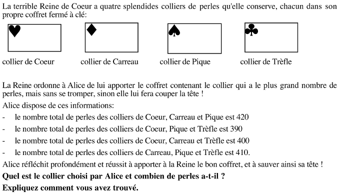 Ou: comprendre que 420 + 390 + 400 + 410 = 3C + 3Q + 3 P + 3 F = 3(C + Q + P + F), donc C + Q + P + F = 1620/3 = 540; de la première information tirer F = 120, de la seconde Q = 150, de la troisième P = 140, de la dernière enfin C = 130; déduire que Alice a choisi la collier de Carreau