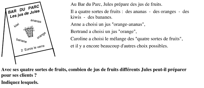 L’élève doit comprendre qu’il y a des mélanges de 4 fruits, de 3 fruits, de 2 fruits ou d’un seul fruit et que, pour chacune de ces quatre catégories, il peut y avoir plusieurs choix. De plus, il doit savoir que l’ordre des fruits n’intervient pas et que par conséquent le jus orange – kiwi est le même que le jus kiwi – orange, par exemple.