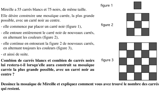 Construire un damier de forme carrée le plus grand possible et avec une case noire au centre en utilisant au maximum 55 carrés blancs et 75 noirs.