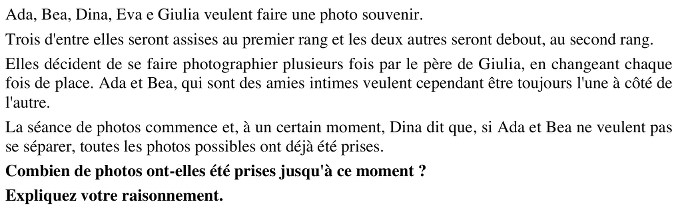 - Si Ada et Bea sont derrière, debout, il y a six permutations des trois amies assises au premier rang : C-D-E, C-E-D, D-C-E, D -E-C, E-C-D, E-D-C, ce qui donne 12 photos possibles avec A-B ou B-A au second rang.