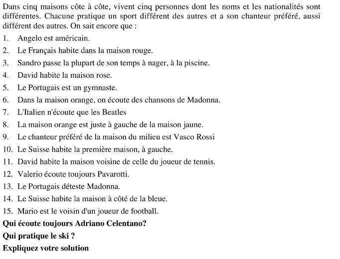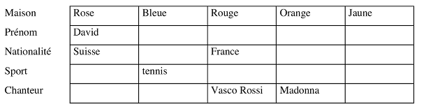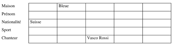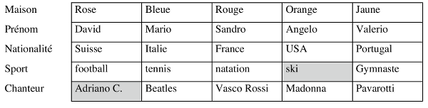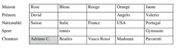 Déduire une information à partir de quinze assertions mettant en relation cinq personnes, leur habitation et leur passe-temps.
