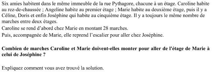 Ou bien déduire que les nombres de marches successifs sont proportionnels à 2 et 3, et que, comme il y a 28 marches pour 2 étages, il y a 42 marches pour monter de l'étage de Marie à celui de Joséphine (solution peu probable pour les élèves de niveau 3).