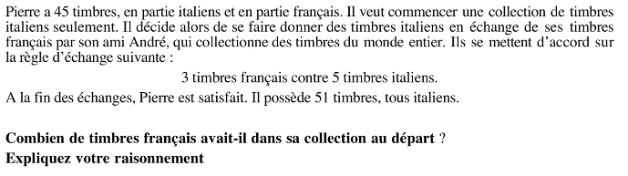Déterminer les nombre de timbres français d'une collection de 45 timbres français et italiens, sachant qu'après avoir effectuer un échanges à 5 timbres italiens contre 3 français, la collection se compose de 51 timbres, tous italiens.