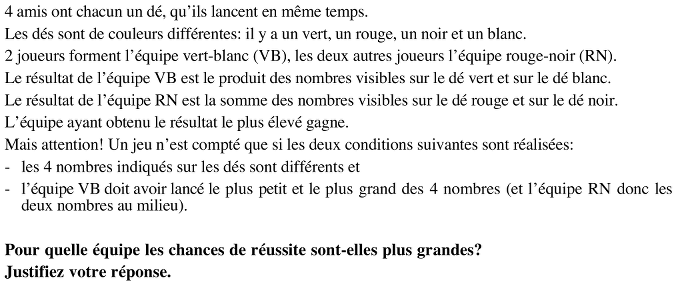 Lors du lancement de 4 dés: V(ert), B(lanc), R(ouge), N(oir) déterminer, dans le cas où les 4 nombres obtenus sont différents et les nombres des dés R et N sont encadrés par ceux de V et B, la probabilité que V+B soit supérieure à R+N.