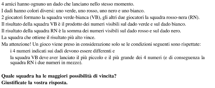 Quando si lanciano 4 dadi: V(erde), B(ianco), R(osso), N(ero) determinare, nel caso in cui i 4 numeri ottenuti siano diversi e il numero dei dadi R e N sia circondato da quelli di V e B, la probabilità che V + B sia maggiore di R x N.